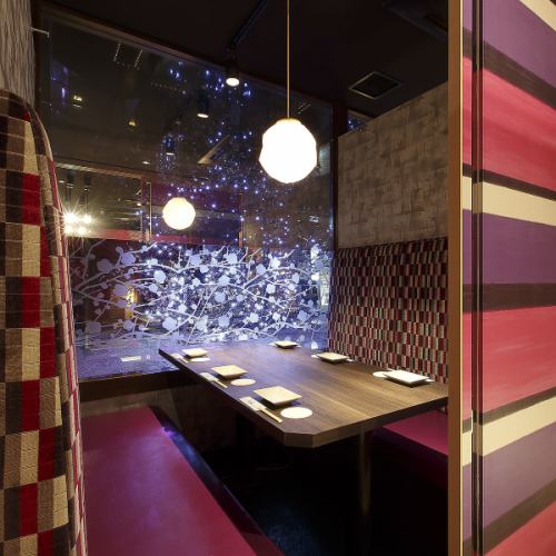 ウメの木が眺められる個室席。自慢の梅の木のライトアップに照らされて乾杯!おしゃれで洗練された空間は、女性のお客様にも好評です。明るすぎず暗すぎない、程よい照明の店内です。